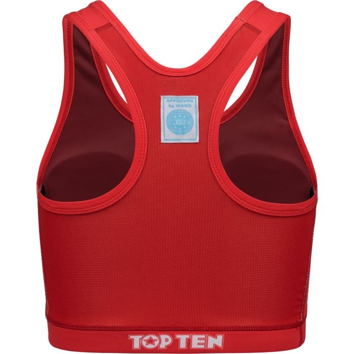TOP TEN Spor büstiyeri “WAKO”, Full Contact, K1 ve Kicklight müsabakalarına katılmak isteyen tüm kadın kickboksçular için mükemmel bir arkadaştır. Ekstra elastik kumaşı sayesinde büstiyer, hareketlerinize mükemmel uyum sağlar, böylece kendinizi her zaman özgür ve güvende hissedersiniz. “WAKO” %100 opaktır ve çıkarılabilir yumuşak kaplarıyla ekstra konfor sunar. Kırmızı, mavi ve siyah renk seçenekleriyle sunulan modelin arkasında WAKO onaylı etiket bulunur.